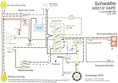 Simson Schwalbe Kr51 1 Kabelbaum Fur 12v Vape Inkl Schaltplan. - Lieferung inklusive farbigen Schaltplan - Passend für serienmäßige Simson Schwalbe mit Unterbrecher Zündung - KR511 KR511S KR511F KR511K Der Kabelbaum wurde in Deutschland in handarbeit hergestellt - Original Kabelfarben und Kabelquerschnitte - Kabelschuhe sind verpresst und verlötet - Inklusive Kabelbinder - Schlange Adernendhülse. Schaltplan für Simson KR511 für VAPE 10 5600.